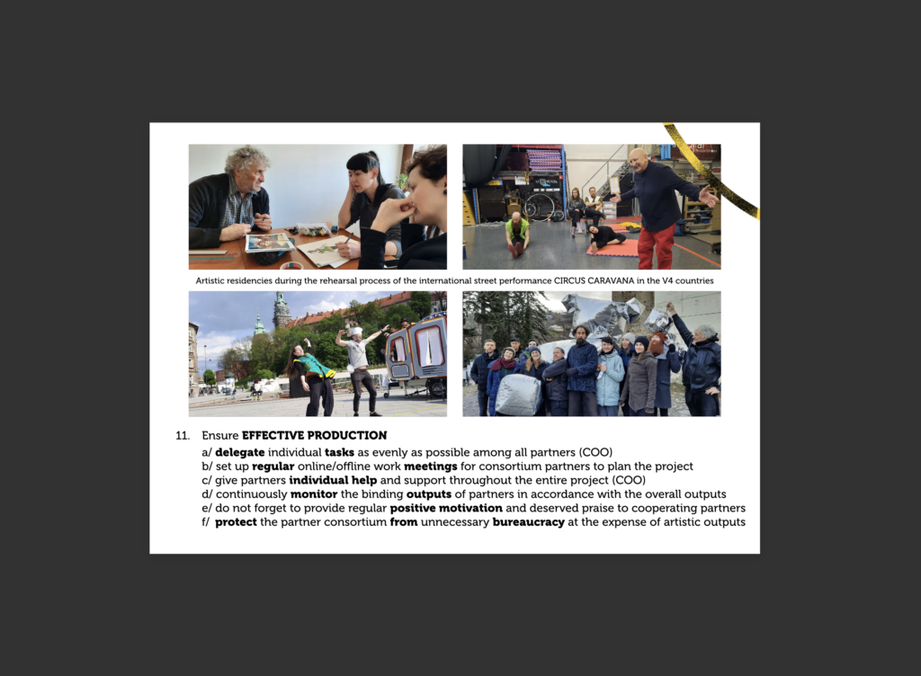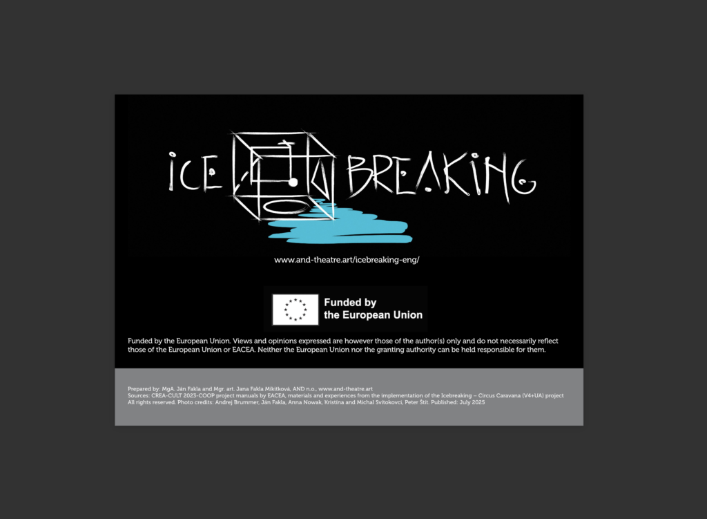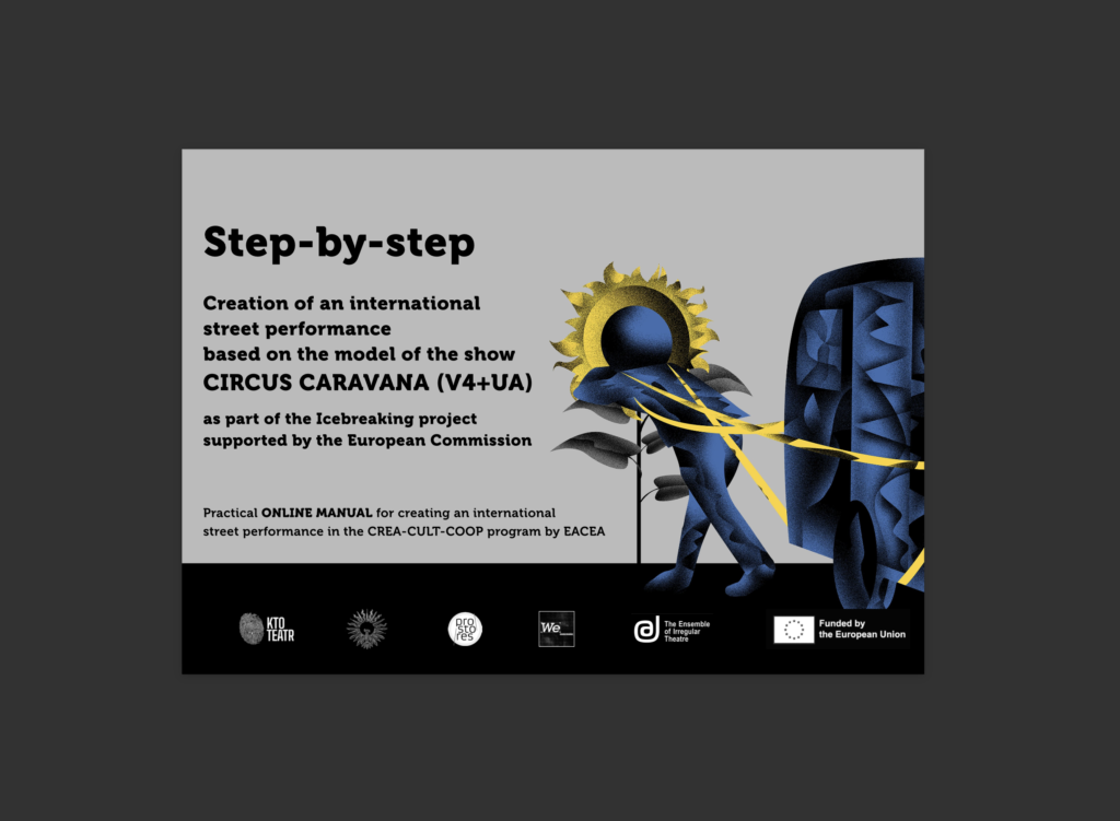 Саме тому проєкт ICEBREAKING мав і матиме низку різних і складних етапів. Весь проєкт складається з 3 етапів: ДОСЛІДЖЕННЯ, HUMAN CARAVANA, CIRCUS CARAVANA. Відправною точкою стало звернення до чотирьох дружніх театрів з країн Вишеградської четвірки та узгодження актуальності теми і необхідності допомогти подолати бар’єри між нами, найближчими сусідами. Що відроджуватиме не упередження, ментальні бар’єри чи поширення ненависті, а взаєморозуміння, людяність і гідність. Ми, Ансамбль Неправильного Театру (AND) з Банської Штявниці, об’єдналися і створили творчий альянс з Театром КТО з Кракова, Krvik Totr з Праги та компанією Firebirds з Будапешту, щоб спільно створити міжнародну вуличну виставу, спрямовану на об’єднання місцевих мешканців країн Вишеградської четвірки та біженців з України. Ми також запросили до партнерства український мультимедійний театр МИ: МЕДІАТЕАТР зі Львова. Кожен із партнерів цієї європейської співпраці відіграє певну роль у проєкті. Словацький координатор відповідає за загальне керівництво проєктом та його режисерську складову, чеський партнер відповідає за написання лібрето, а згодом сценарію продукту, польські та угорські театри представлені переважно своїми акторами як перформаторами продукту, а українська команда збагачує проєкт кіно та документальним виробництвом.