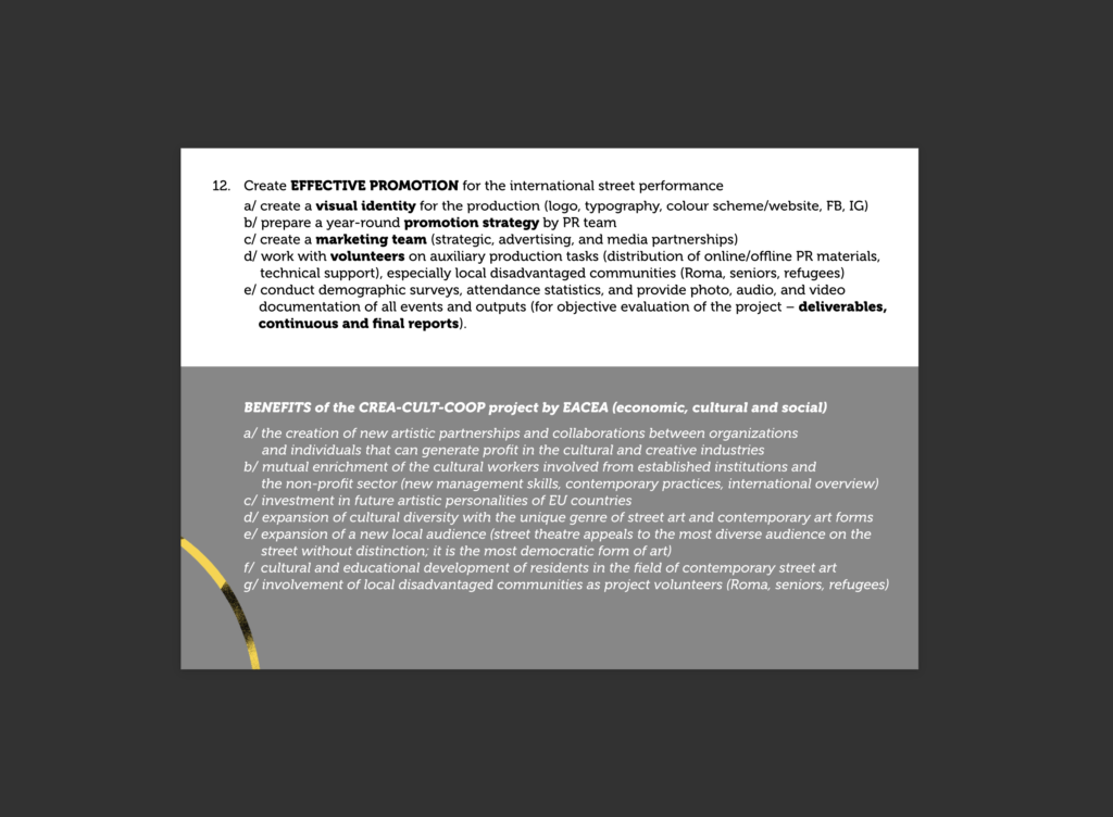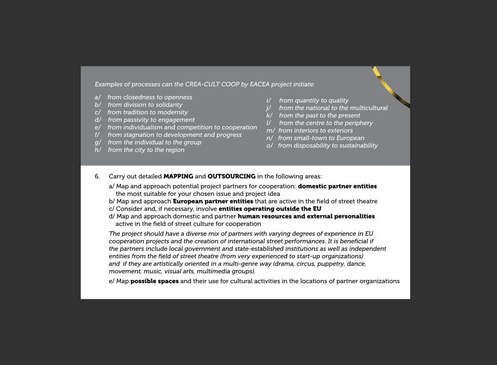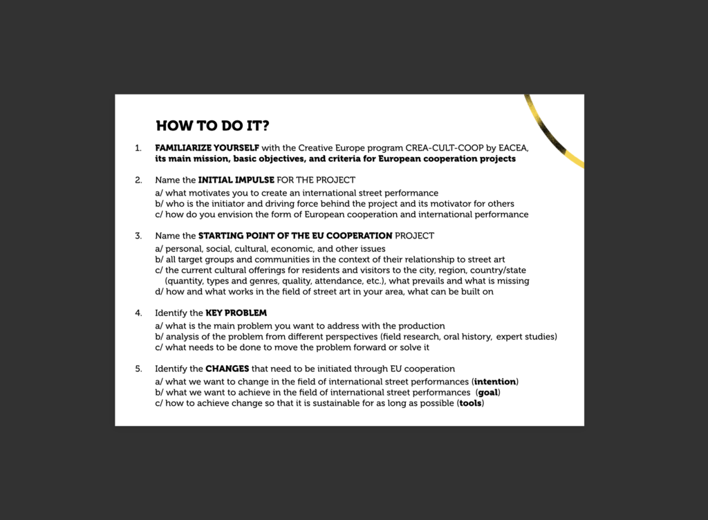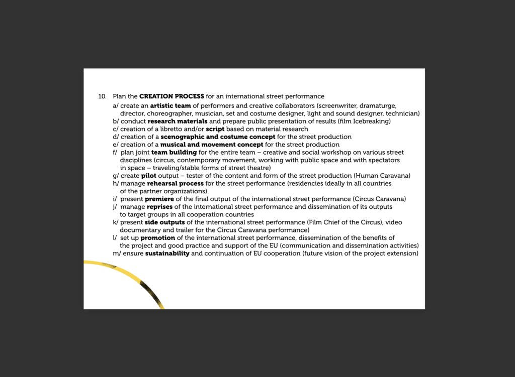 Четверо партнерів на чолі з AND (координатором проєкту) створять вуличний перформанс "CIRCUS CARAVANA", спрямований на зближення громадян країн Вишеградської четвірки та українських біженців. 1. ICEBREAKING стане оригінальним фізично-візуальним вираженням соціальної інтеграції, який з допомогою театру розповідатиме історії людей з багатонаціональних громад. ICEBREAKING стане оригінальним фізично-візуальним вираженням соціальної інтеграції, що розповідатиме історії людей, які живуть у багатонаціональних громадах, за допомогою театру. Театру, який руйнує упередження, демонструє переваги глобального співіснування та зближує людей.