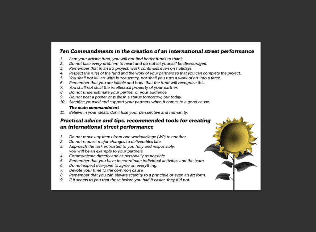 Показ відбувався на бетонно-мощеній поверхні розміром 25 × 30 метрів, глядачі сиділи або стояли півколом, а фоном слугували дерева та високі стіни Вавельського замку. Музично-рухова вистава з чудовими художніми й акторськими роботами міжнародної команди виконавців із театру Teatr KTO (PL), організації FIREBIRDS (HU), співтворців театру Krvik Totr (CZ) та ансамблю Irregular Theatre (SK) захопила як дітей, так і дорослих і літніх глядачів.
